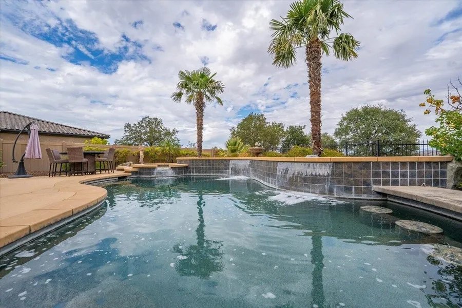Outdoors, the magic unfolds. A sparkling pool with a rare swim-up bar creates a resort-style atmosphere, perfect for summer gatherings or simply soaking in the views after a long day. Elevated on its hilltop setting, the property enjoys a sense of privacy while remaining close to conveniences.