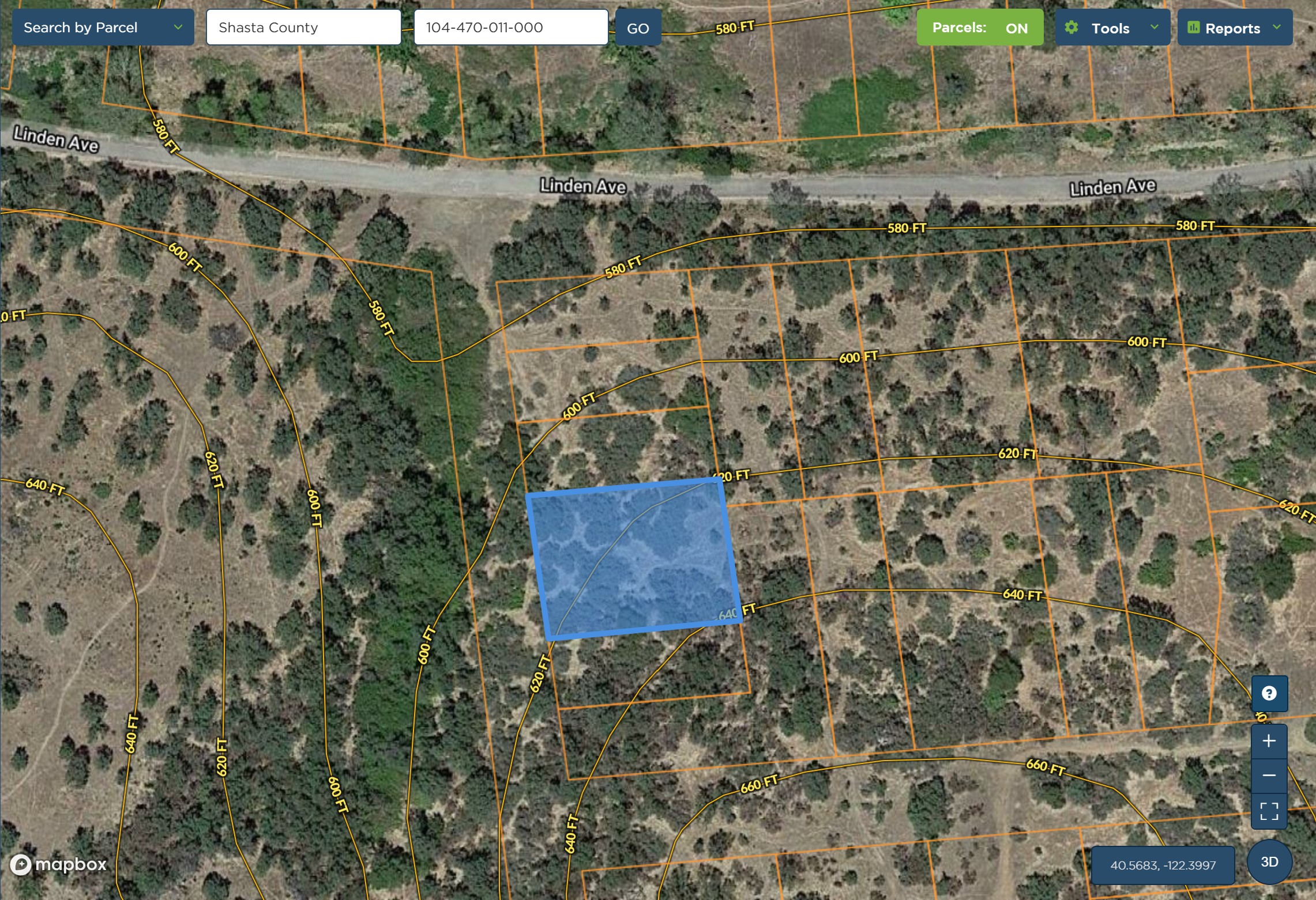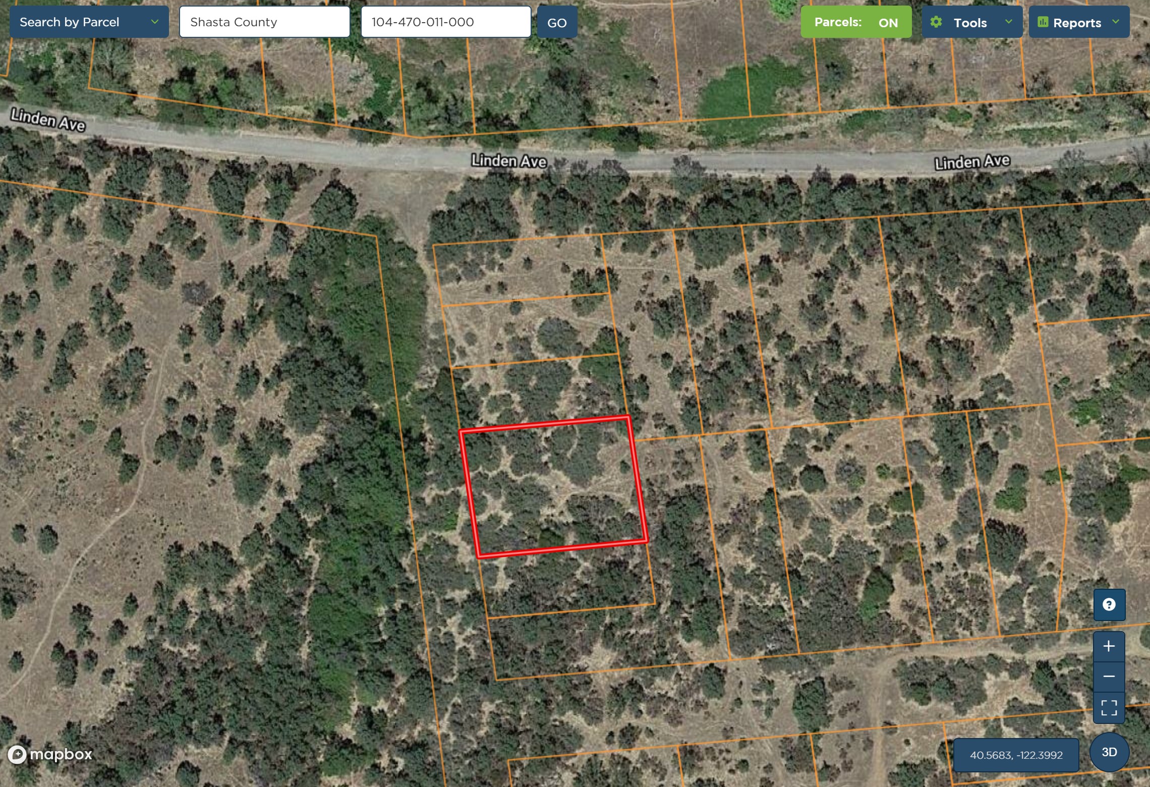 For example: copy and paste 40.56876, -122.3987 (with the comma and the dash) into the search bar in Google Maps to find the exact location. We recommend this method as the best way to locate the property because the land will be unmarked with no signs or survey stakes.