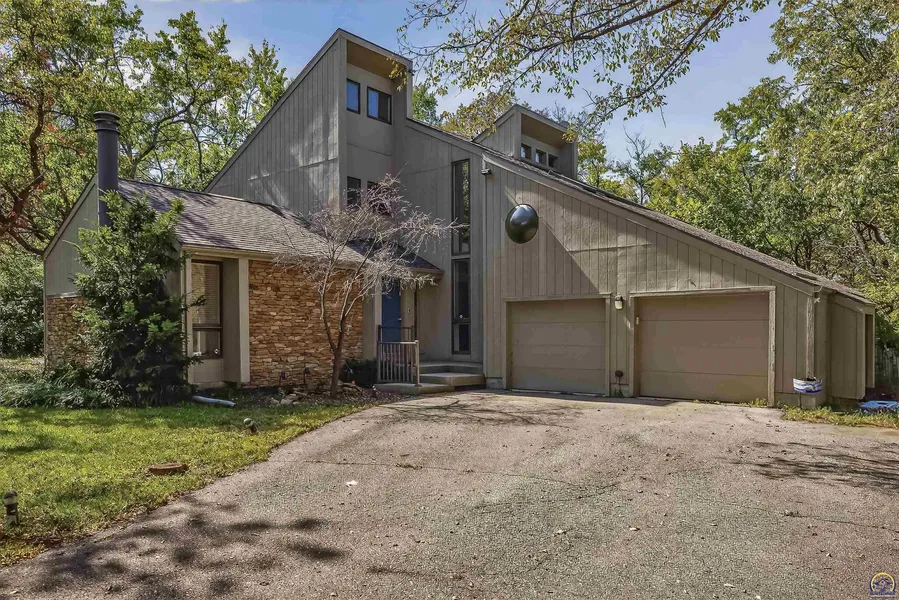 Phenomenal! Built by a local acclaimed Topeka architect with his also acclaimed interior designer wife as their personal home. Hidden on acreage in the highly sought Walnut Woods Estates development, surrounded by trees and Mother Nature. Fantastic layout from the living room with a sunken custom-made sofa and fireplace, to the dining room with a mirrored ceiling and the spacious kitchen and cabinets, and a separate family room, both with sliders to the entertaining deck. Spiral up to the 2nd level office and play space, spiral up again to the ensuite primary with tub and walk-in closet, another full bath (both baths with vaulted ceilings and windows), and two more bedrooms. Spiral down to the wide open and spacious basement space and find another potential bedroom, 1/2 bath, tons of storage, and tons of opportunity for you to set up your living space. Note the back stair exit with cellar doors, the round dome windows on the 2nd level, and did you notice the spiral staircase? Outside roam the grounds, hike and walk the snake-like driveway, and keep all your garden tools in the shed designed to match the house! Phenomenal can be yours!