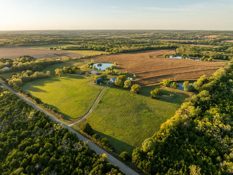 To the north of the home is where this special piece of ground gets exciting for the outdoorsman! There are 3 beautiful ponds full of fish including crappie, bass, and catfish. Most of the time you will find Canadian Geese and various species of duck using these ponds flying in from Clinton Lake. It is definitely in the flyway! There are 33 acres previously entered into CRP that provide amazing cover for the booner whitetail Kansas is known for and the plentiful Eastern Turkeys! The CRP bedding is surrounded on 3 sides with timber littered with oak trees, cedars, draws, and Clinton Public ground making the CRP prime bedding. Imagine this, in the middle of the CRP, I can picture sitting in a Redneck blind overlooking a few acres of green lush clover, as deer pile into the only food source around after the area's crops are pulled. A mature bruiser buck chasing does around the field during the rut sounds magical! With the easy south access on the east and west sides of the property, you are bound to have the perfect scenario for a great rut hunt in sweet November!