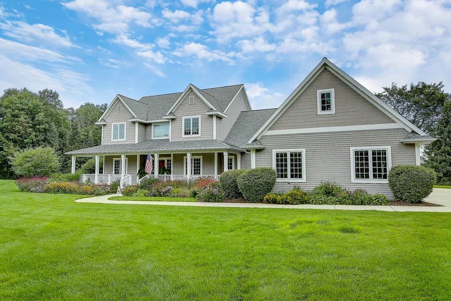 An extraordinary opportunity to own a home in Elkhart Lake set atop beautiful rolling hills and the 5th hole of Quit-Qui-Oc Golf Club. Stylish spaces and expansive views of this 6,000+ Sq Ft home set on 1.4 acres allow upscale year round casual living and entertaining. The home welcomes you with a gracious foyer leading you to a lodge-style great room and vaulted wood ceilings, heavy beams and a 2-way stone fireplace. Chef's kitchen w/ top of the line appliances, a den/study, and the perfect main level master suite w/ spa-like ensuite bath and spacious closets. Walk out lower level family room features another gorgeous stone fireplace, full wet bar and media room. Take stone steps down to your private cart path allowing for access to the golf course. This home has it all!