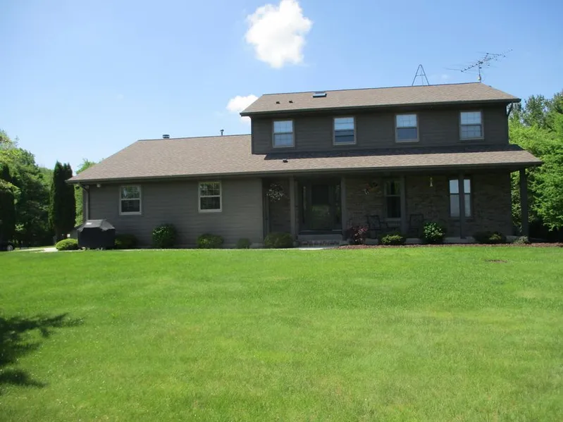 SPACIOUS COUNTRY TWN RHINE 28 YR custom built 3 bedroom, 2.5 bath, 2,270 sq ft COLONIAL located on 22.33 acres remodeled throughout. 20X30 Outbuilding, 24x24 attached garage with openers. Family Room with brick fireplace newly carpeted with skylights & bay windows overlooking back yard, Natural cabinet kitchen & dining area with Bruce hardwood floors with access to wood deck overlooking back yard & newer appliances. Living Room & Formal Dining Room carpeted. Master bedroom with vaulted ceilings walk-in closet & master bath with 5ft shower & skylight. Basement with 14X13.7 office area with regress window. Carpeted Rec Room with patio doors leading to concrete patio. First floor laundry room and half bath. 6X22 front concrete entry porch. Propane gas for heating. Central vacuum in home