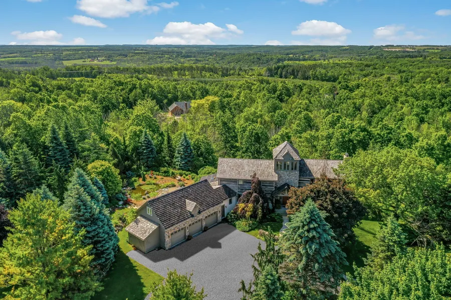 Breathtaking views and the perfect rural setting less than 30 minutes to world-class golf and a stone's throw from Elkhart Lake. Beautifully built custom home with hand-hewn log elements, stone and generous room sizes. First floor features large living room with fireplace, formal dining room, chef's kitchen, glass sunroom and screened porch. En-suite primary bedroom with walk-in closet and a fantastic third-floor loft perfect for an office or den. Wonderful outdoor patio with koi pond and water feature resplendent with mature plantings and lily pads! Two beautiful barns for animals, toys or conversion to additional living space. Enjoy expansive views over rolling hills and bucolic pasturesa true paradise for anyone looking for privacy and space but still close to the action.