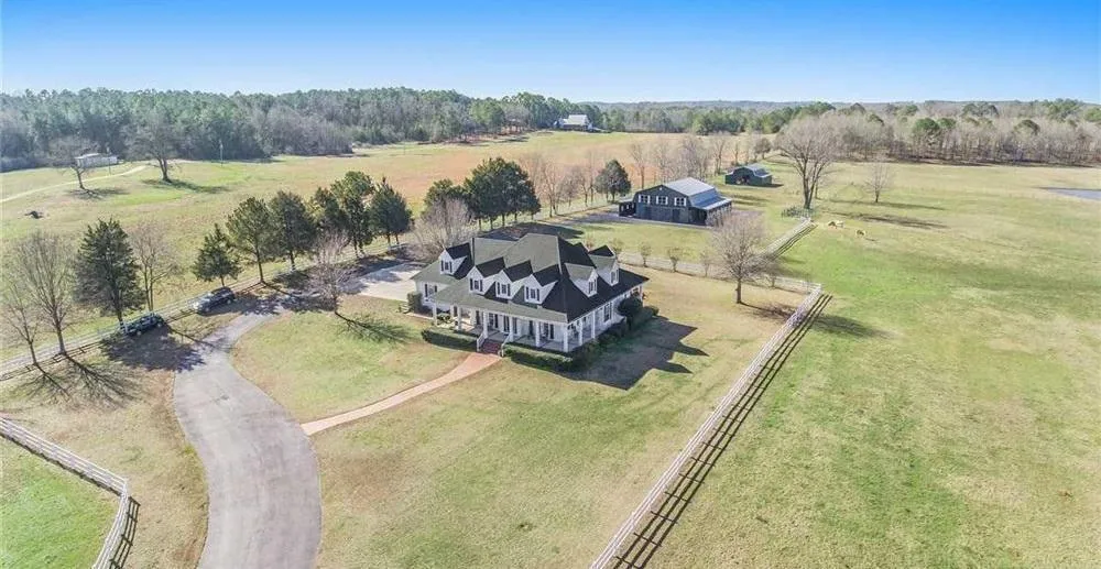 Here you have it, 33 acres of open pasture land to entertain a crowd. Old-southern style home features wrap around porches with multiple access doors and outdoor entertainment areas. No details spared with custom cabinets and floor to ceiling windows offering tons of natural light and a storm shelter. Big barn with office, six stalls, birthing stall, tack room, wash area and large bays on each side. Upstairs was designed for entertaining and has its own studio with stacked stone fireplace, balcony, bar, full kitchen and full bath. Acreage is fully fenced and includes a corral, seven feeding stalls and year round pond. There is also a large pole barn to store additional equipment. For more information or to schedule a tour, call us today! Listing provided by: Daniel Worthington
