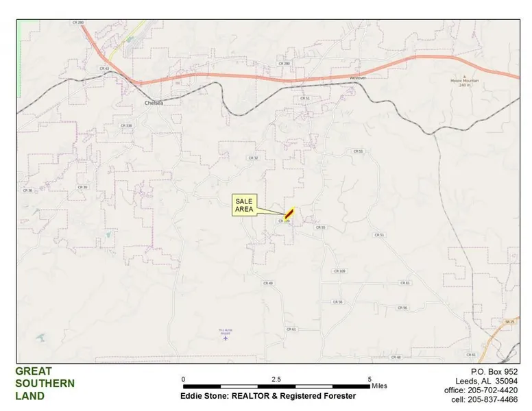 20 awesome acres located near Chelsea in Shelby County, AL * Great rural neighborhood * Yellowleaf Creek flows through the property * Large mature pine and hardwood * No road frontage but only a short distance from County Road 109 * 60 foot easement to the property * For more information and an tour, contact Eddie Stone, 205-837-4466