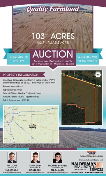 Legal Description: 103.972 acres more or less located in a part of the SW 1/4 of S3 containing8.544 acres more or less, and a part of the SE 1/4 of S4 containing 7.433 acres more or less, and a part of the NE 1/4 of S9 containing 16.699 acres more or less, and a part of the NW 1/4 of S10 containing 71.296 acres more or less, all in T14N, R7E, Van Buren Twp, Shelby County, State of Indiana.