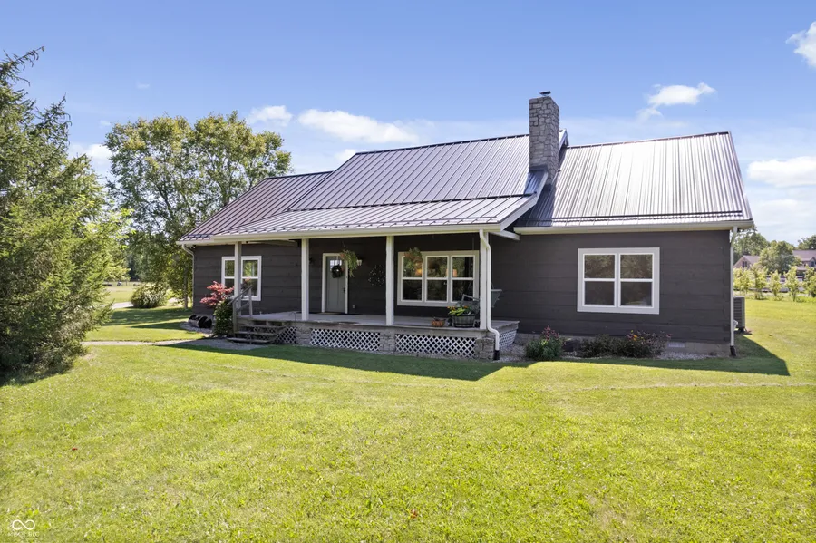 Your dreams of rural living in a charming chalet-style log home are ready to come true! Situated on 6 acres with Sugar Creek *on site,* you'll enjoy both scenic views of expansive fields AND wooded terrain with kayaking just outside your backdoor! An oversized front porch makes a great first impression and serves as a perfect outdoor living area. Inside you are amazed by 23-foot soaring ceilings with open, exposed framework. Imagine your favorite lodge - this is it! Open concept main living/dining/kitchen areas are perfect for large family gatherings. This home is incredible during the holidays (ah-hem... HUGE Christmas tree opportunity)! An impressive floor-to-ceiling masonry fireplace is the focal point and features a blower insert that can heat your whole home in the winter if you desire! Gourmet kitchen with a cooktop and separate ovens plus a pantry - not to mention an oversized overflow pantry around the corner. Incredible storage! The primary suite is split from the spare bedrooms and offers tall ceilings that carry throughout, an enormous walk in closet and full en-suite bath with linen storage. Spare bedrooms are generous in size and adjacent to an updated full bath. Last but not least your expansive sunroom makes for the perfect flex room - great for a home office/hobby room/playroom/home gym... endless possibilities. The sunroom opens onto the rear porch and is just steps away from the 2 car garage. This outbuilding not only serves as a garage but also has a separate bonus room currently being used as an office. Great way to keep home life and business life separate! The 2nd outbuilding is even larger with both workshop/garage space and the most amazing "man cave" space! Heated too!! Previous owners outfitted this building with a bathroom and a kitchenette! Perfect opportunity for a home-based business! Updates include new HVAC, almost all new windows and brand new metal roofing with a 50 year transferrable warranty!