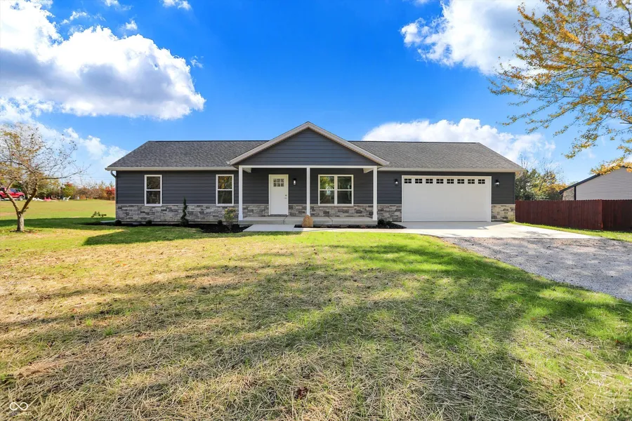 RARE opportunity to buy a BRAND-NEW home in Triton Schools! Pull up prepared to be wowed! This beauty boasts of 3bds, 2 bths, laundry, office, and open concept LR/Kit in 1,604 sq ft on almost 1/2 acre, only 5 minutes to the Fairland or London Road and I74 exit ramps! Enter entertainment central from the covered front porch, with a prime view of the spectacular kitchen, built with white shaker cabinets, fantasy brown granite, and a pantry closet with easy access to the rear patio for all of your summer cookouts! Split floor plan, continue into the primary suite where you can watch the sun rise over the field to the east, with a full bath, walk in closet, and private exit to the rear patio! Head back through the dining area, turn right down the hall, find the laundry/mech room w/ a wash tub immed on the right and office to your left. 2 bdrms and bath follow! Schedule your personal tour...