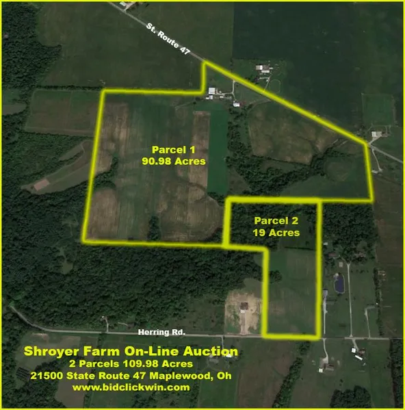 Parcel # 1 will include 90.98 Acres with older 2 story home and barns with 70 acres MOL tillable. Parcel # 2 will include 19 acres of which 10 are tillable. Parcel # 2 is located along Herring Rd.