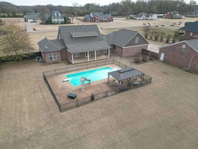 Estate-style living in Osborne Meadows. This impressive home features a wrought-iron fenced pool with slide, pool gazebo, and included pool equipment perfect for entertaining. Inside, enjoy a granite kitchen with custom cabinetry and double ovens, recessed lighting, and elegant arched doorways throughout. The functional layout offers three bedrooms on the main level, including the primary suite with a jetted soaker tub. The laundry room includes washer, dryer, and space for an additional refrigerator. Car and hobby enthusiasts will love the six-car garage capacity, including a 48x48 detached workshop/garage with full bath and loft space. New water heaters, and a new 4-ton Bryant HVAC system. Entry key provides access to the side door of the standalone garage. Roof is 3 years old
