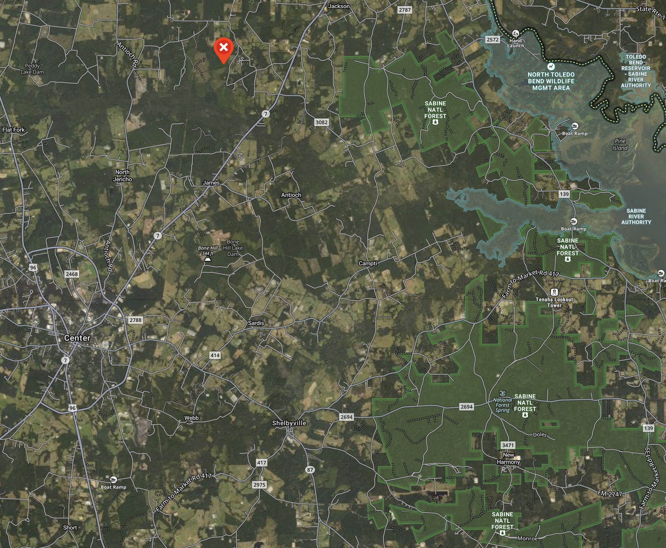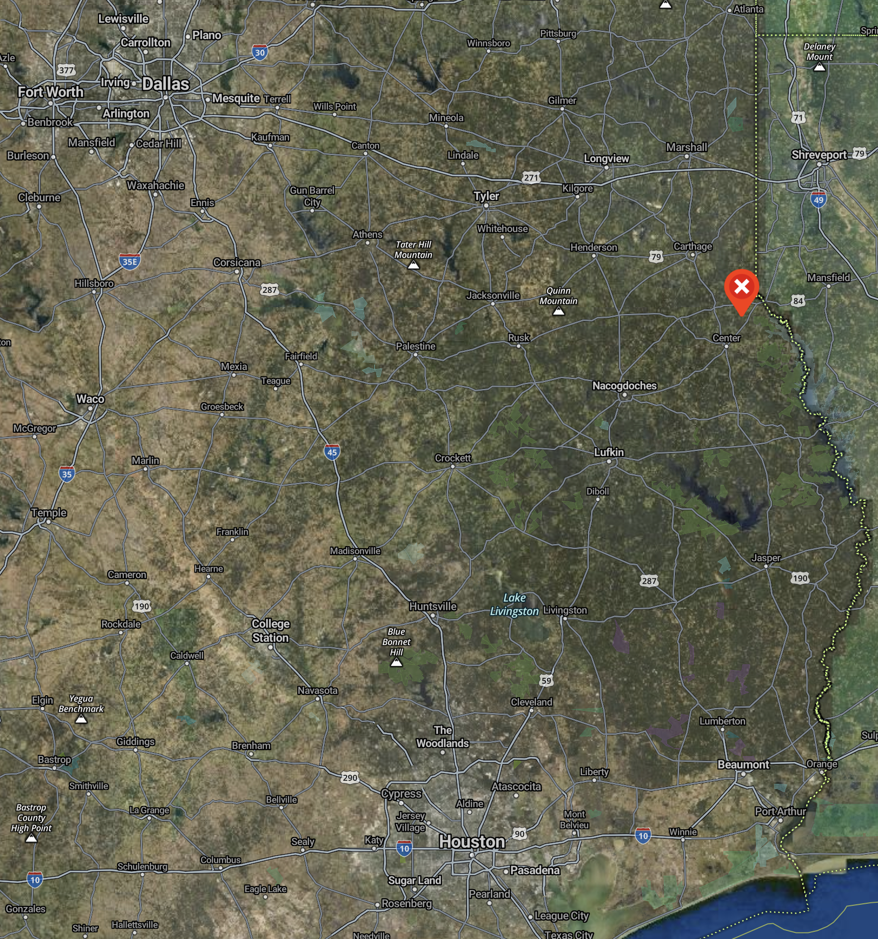 When it comes to location, it doesn’t get much better. The property is tucked away in the quiet, untouched countryside just 10 minutes from Center, TX, and surrounded by large ranches and rolling terrain. It’s only 45 minutes from historic Nacogdoches—the oldest town in Texas—with its college-town energy, cultural charm, and brick-lined downtown.