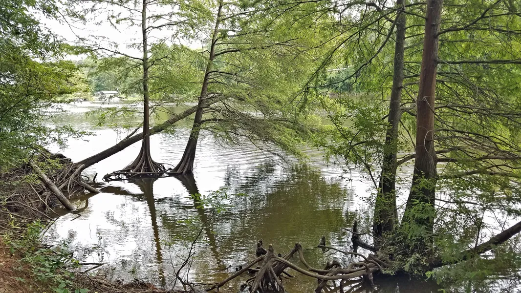 The riverfront sand-ridge forest is populated with a wide variety of trees, including water oak, baldcypress, loblolly pine, American holly, sassafras, sweetgum, hickory, willow oak, black cherry, red maple, cherrybark oak, yaupon holly, redcedar American elm, blackgum and river birch. The presence of so many species dependent on well-drained soils is an indication of the Hainesville fine sand soil type that comprises the majority of the tract.