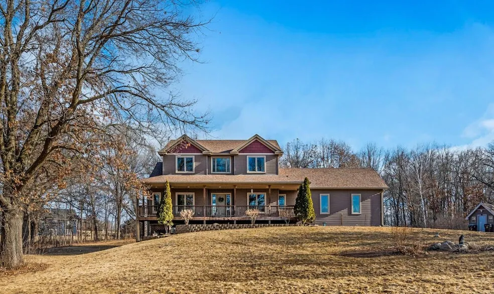 This beautifully maintained two-story home sits on 2.5 scenic acres and offers a perfect blend of comfort and functionality. The main level features hardwood floors, a spacious primary suite with a tiled shower and jacuzzi tub, a gas fireplace, built-in cabinets, main-level laundry, and a surround sound system on the main level of home, garage, and outdoor spaces. The kitchen and living areas flow seamlessly, creating an inviting atmosphere. Upstairs, a catwalk overlooks the main living space and connects three spacious bedrooms and a full bathroom with double sinks. The walkout lower level provides additional living space with a fully finished bedroom and bathroom. Basement family room is finished with no flooring. Outdoor amenities include a stunning big cedar front porch and an oversized 43x26 heated, insulated, and taped garage with the potential for a future bonus room above. Major updates include a new A/C, furnace in 2018 and a 104-gallon water heater, roof replaced in 2017, and new siding and gutters in 2020. This stunning home offers space, style, and updates in a peaceful setting - schedule your private showing today!