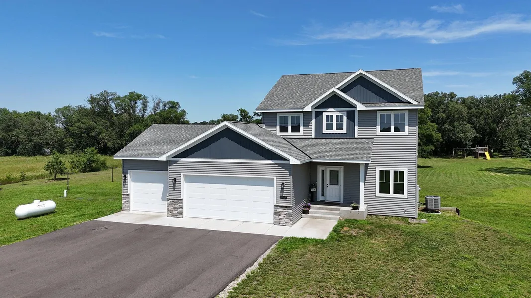 Set on over 3 peaceful acres along the beautiful Elk River, this 2023-built two-story home has all the space and comfort you've been looking for. With 4 bedrooms, 3 bathrooms, and a flowing layout, there's room for everyone. The main floor features a light-filled kitchen with stainless steel appliances, a walk-in pantry, and a spacious center island-perfect for casual meals or gathering around with friends. Warm wood floors add charm, while the cozy living room with a fireplace invites you to settle in and relax. You'll also find a versatile den and a handy half bath on this level. Upstairs, all 4 bedrooms offer space to unwind, including a generous main suite with a walk-in closet. The laundry room is right where you need it-no hauling baskets up and down stairs. The lower level is unfinished-ready for your personal touch, whether that's a movie room, home gym, or play space. Outside, enjoy a 3-stall garage, a paved driveway, and a yard that's ideal for backyard games or quiet evenings by the river. It's a well-designed home in a gorgeous setting-just waiting for you to make it yours.