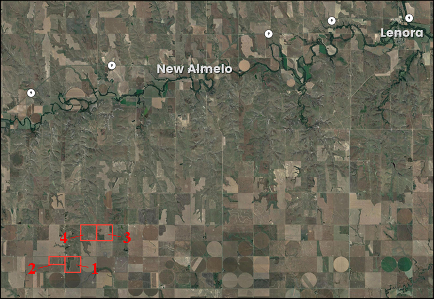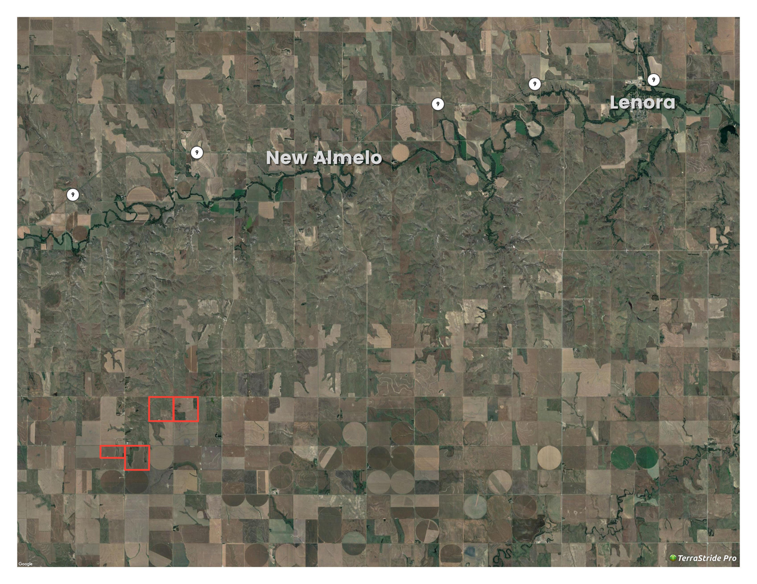 Research Parcel InformationFrom New Almelo, KS, drive approximately 7.5 miles west on Highway 9 turning south on 2600th Road. Continue on 2600th Road for 6.5 miles, turning east on County Road 110 N. Drive 3 miles east to the intersection of County Road 110 N & Road 130. Tract 1 will be located on the southeast corner of the intersection and Tract 2 will be located on the southwest corner of the intersection. From the intersection of 110 N & Road 130, continue west on Road 120 for 1 mile. Turn north on N Road 140E and drive for .5 miles. The southwest corner of Tract 3 begins on the east side of the road and the southeast corner of Tract 4 will be on the west side of the road. Signs will be posted.