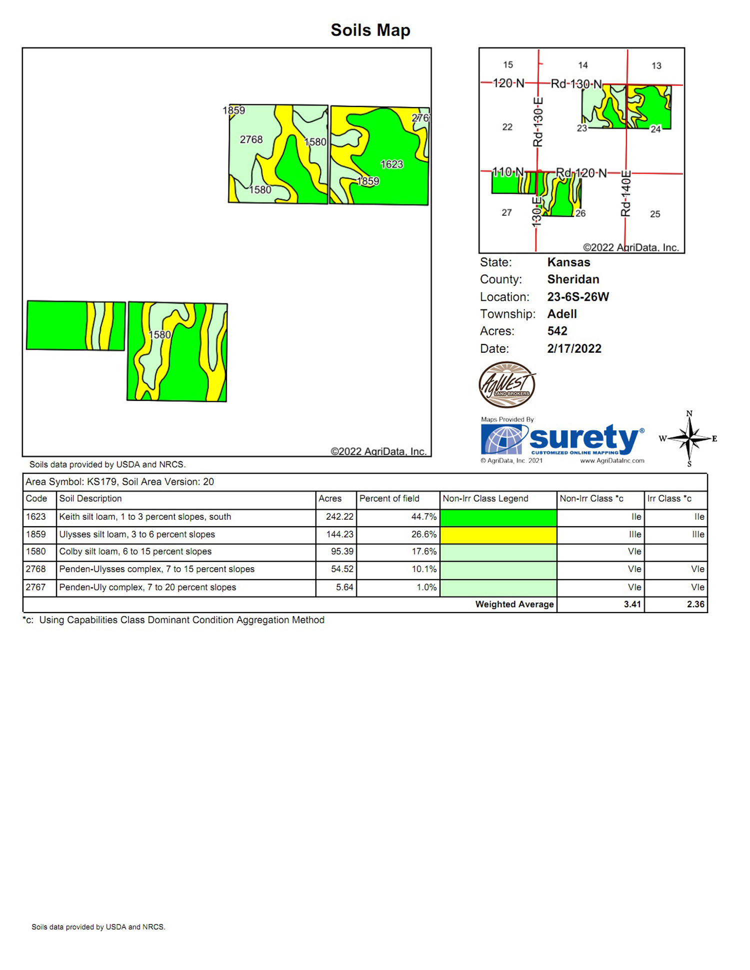 This very productive 545.45 +/- acre dryland farm offers a great opportunity to add premium acres to your farm or land portfolio. Boasting 327.65+/- acres of prime Class II & III soils on over 90% of all tillable acres and a near flush topography, you don't find many farms of this caliber on the open market. These tracts are open to the new buyer for the 2022 crop year. Several grass draws running through these tracts are scattered with thickets, brush, & heavy CRP grasses providing perfect wildlife habitat for the abundant mule deer and upland game on these properties.