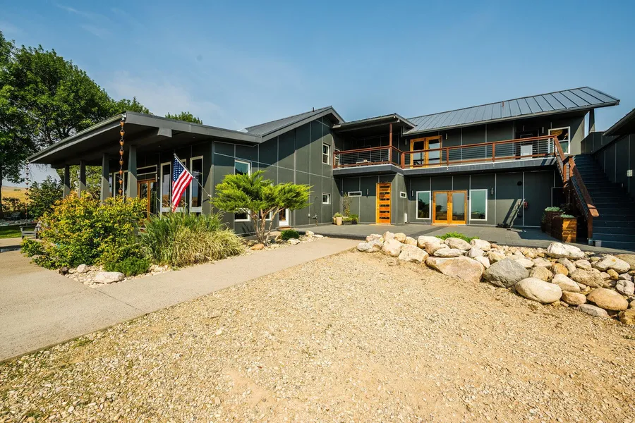 Welcome to 10 South Fork Drive. This stunning contemporary retreat boasts unmatched private enjoyment of all that Big Horn, WY has to offer. Situated on nearly 5 acres at the end of a quiet road, this exceptional home offers panoramic views of Moncreiffe Ridge and the Little Goose Valley. Designed for entertaining, the open-concept kitchen, dining, and living spaces flow seamlessly to multiple outdoor areas—including a patio with a cascading water feature, a sheltered stamped-concrete courtyard, and an upper balcony off the Owner's Suite. The chef's kitchen is a standout, featuring a commercial-grade Imperial gas range with griddle and broiler, HD ventilation, three sinks with industrial disposals, and solid rock maple butcher block counter tops. A striking contemporary-industrial aesthetic runs throughout, with exposed steel I-beams, tread-plate stairs, and slate tile flooring. Upstairs, you'll find two comfortable guest rooms and a full-width mezzanine overlooking the kitchen and living space. The spacious Owner's Suite boasts private balcony access, dual walk-in closets (one with a dry sauna), and a luxurious bath with oversized tub, dual vanities, and walk-in shower - all bathed in natural light. Additional amenities include a large office/den, a 2-car attached garage, and a 1,300 sq ft heated shop with 200-amp service, three large overhead doors, and an air-conditioned 430 sq-ft upper-level studio apartment complete with an expansive deck and greenhouse. The shop can also be retrofitted for equestrian use, and the fenced loafing shed is ready for horses or livestock. Dog lovers will appreciate the fully-wired perimeter fence. Outdoor living is a dream here, with a 0.1-acre private reservoir and deck, SAWS water, and irrigation rights from Park Reservoir via the Peralta Ditch. Landscaped lawn and garden areas are supported by automated sprinklers. Community amenities include a mowed walking path, pond for swimming/fishing, and ice skating. Located within 5 minutes of the Big Horn school campus and 10 minutes from the Powder Horn Golf Community, Brinton Museum, and Red Grade Road accessing the Bighorn National Forest, this one-of-a-kind property offers the perfect blend of luxury, privacy, and convenience.
