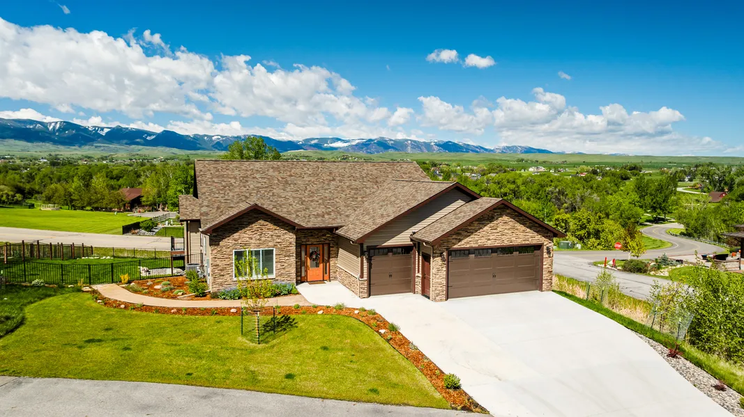 From the kitchen and dining area, step out to the expansive back deck perfect for morning coffee or evening sunsets overlooking a fully fenced backyard. The luxurious owner's suite offers captivating mountain views, a tray ceiling, private deck access, and a spa-inspired bath featuring dual vanities, a generous tiled shower, and a custom walk-in closet. Additional main-level highlights include a dedicated office or den with French doors, a stylish powder room, a guest ensuite bedroom, and a spacious laundry room with abundant cabinetry and a prep sink. An elegant open staircase leads to the full walk-out lower level, where you'll find two large, light-filled bedrooms, a full guest bath, and a versatile bonus room ideal for entertaining or relaxing. This level also includes expansive storage and mechanical rooms, plus a sliding glass door that opens to a covered patio. Additional features include designer lighting throughout, top-down bottom-up window coverings, durable LVP flooring, a low-maintenance exterior with stone accents, maintenance-free siding, and 40-year Malarkey shingles. A three-car garage provides ample storage and parking. Set on a premium lot within the sought-after Powder Horn community, this exceptional home captures panoramic mountain views from nearly every room offering the perfect blend of comfort, style, and Western charm.