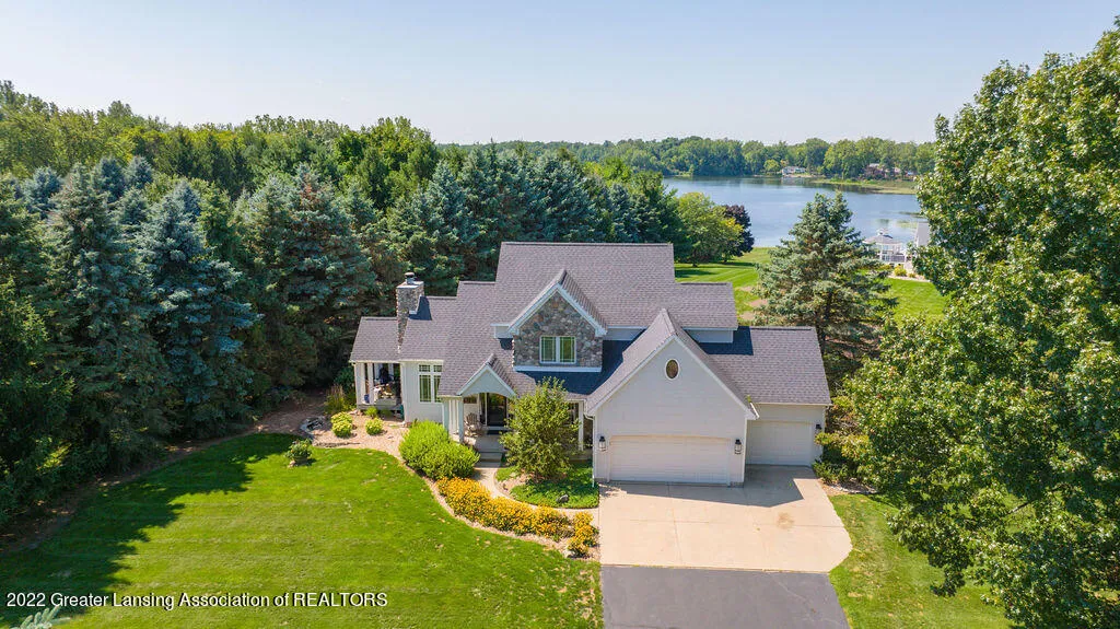 Scenic Lake. Fabulous waterfront home on this all-sport's lake! Swimming, boating, walking path, ice skating and hockey, plus fishing for bass, pike, and walleye just to name a few. Nestled on approximately 1.8 acres with views galore and nicely nestled off the road. This cottage and home in one is truly special with its craftsman design both inside and out. The front porch is welcomingly accented with shaker shingles leading to the dramatic foyer and great room including special ceiling heights and amazing beam work, anchored by a stone fireplace. Enjoy access to covered porch with stone walls and overhead heating - an amazing space to relax and catch a sunset or sunrise sipping coffee.