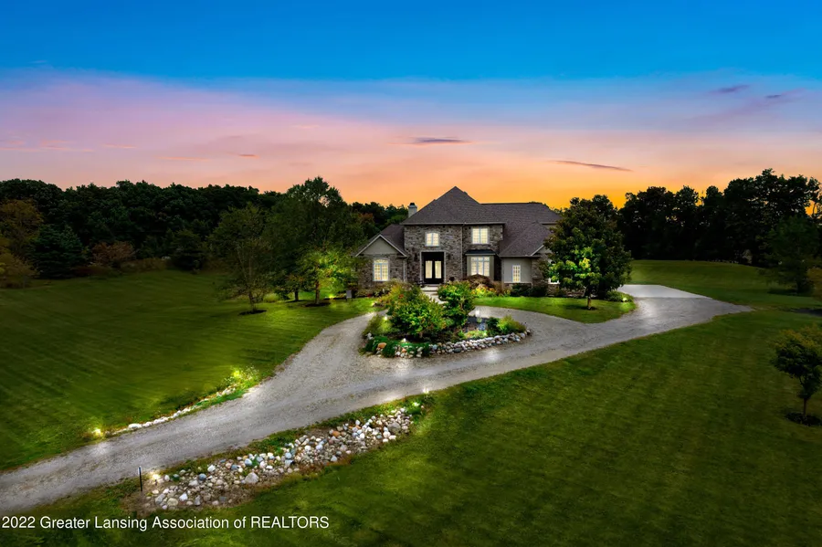 Welcome to Garrison Rd. Just minutes from charming downtown Laingsburg. This custom-built past parade home features 4 bedrooms, 3 full bath and 2 half baths. Over 3600 Sq ft of finished space with loads of options for more. As you enter the home you are greeted by 10-foot custom double doors, soaring ceilings, and hardwood floors. Off the foyer is a large office with French doors, Extensive railing, and curved staircase. Just Awesome! A large vaulted great room with stacked windows overlooking the gorgeous custom patio with real fireplace. Formal dining room just off the kitchen. Great custom kitchen with Decora cabinets, Soap stone counter tops and stainless-steel appliances,4 burner gas stovetop with grill made by Jennaire, Double Oven.