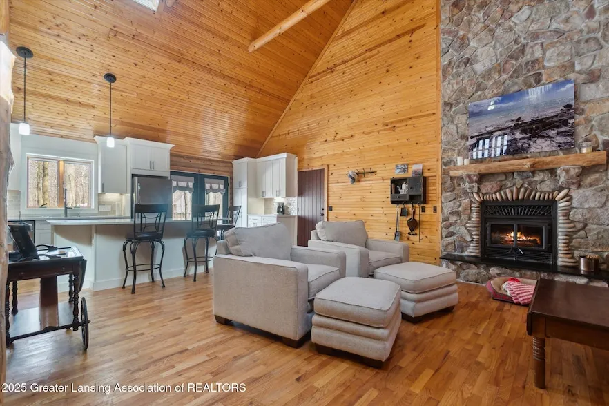 Welcome to 3553 Leland Rd in Laingsburg, MI a custom full-log home on 1.32 acres with everything you need for homesteading or hobby farming! The great room's stone fireplace, updated kitchen, and loft primary suite create a cozy yet modern retreat. A walk-out basement, covered front porch, and large back deck offer extra space to relax.Outside, a huge 32' x 56' pole barn with a 12' door, commercial air compressor, and hydraulic car lift is perfect for projects. With space for chickens, a garden, and crops, this property is packed with potential!