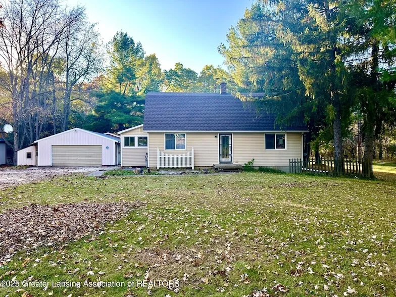 Welcome to this charming country Cape Cod nestled on 1.97 peaceful acres! This 3-bedroom, 2-bath home offers the perfect blend of rural tranquility and modern comfort. The spacious living room is filled with natural light, flowing into the dining area and an oak kitchen complete with all appliances. A main-floor bedroom and full bath add convenience, while the adjoining sunroom/mudroom with brand new windows invites you to relax and enjoy the views. Upstairs, you'll find two additional generous bedrooms and another full bath. The lower level provides plenty of potential with a daylight window, pantry area, and walkout access. This home is equipped with efficient geothermal heating and cooling, plus a new roof (2022) for peace of mind. Enjoy the outdoors on your wooded lot with only one direct neighbor and serene open-field views from the front. The property features a garden area, firepit, raspberry patch, and a spacious deck with a gazebo perfect for entertaining or quiet evenings under the stars. The two-car garage/pole barn includes a workshop and a side poultry coop for hobbyists or homesteaders alike. Country charm and space to breathe this one has it all!
