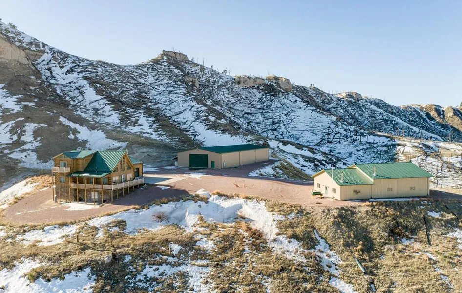 This 45 acre paradise has views beyond compare and is extremely secluded with end-of-the-road privacy. The property features an incredible log home, a large 45x70 shop building featuring a great man cave area and a huge 55x120 equipment building. The handcrafted log home is 1 stories with approximately 3,256 sq. ft of finished living space complete with three bedrooms, three baths and elevator. The open floor plan on the main level creates a spacious combination of living room, dining room and kitchen space with an abundance of windows and rock accents throughout plus an ornate wood cook stove inset in dining room. Also on the main level is a bedroom and bathroom, plus access to the attached garage through the mud room/laundry room. An expansive wrap around deck surrounds the majority of the main floor. The upstairs loft features an open area and master bedroom suite with its own ba...