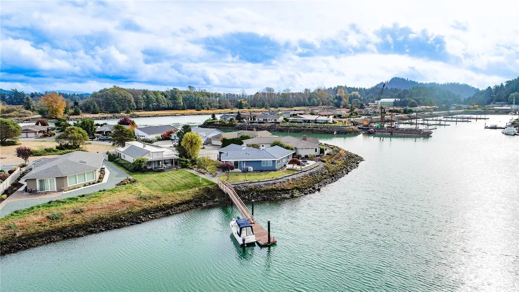 Just across the Rainbow Bridge in La Conner, tucked away in Shelter Bay with 120' of waterfront and a 30' shared dock, you'll find this 1975 single-level 2-bedroom home with views from almost every window. One of the first homes built in Shelter Bay, featuring great entertaining space, it is open and airy, with windows throughout - and most with stunning waterfront views. Enjoy cool evenings by the centerpiece wood stove and beautiful rock mantle. You can sit up in bed in the primary bedroom suite and see your boat at your dock. Enjoy evening sunsets relaxing on the large patio. And don't forget Shelter Bay amenities like pools, sports courts, events and private beach. This hidden gem is move-in ready and waiting for you - bring your boat!