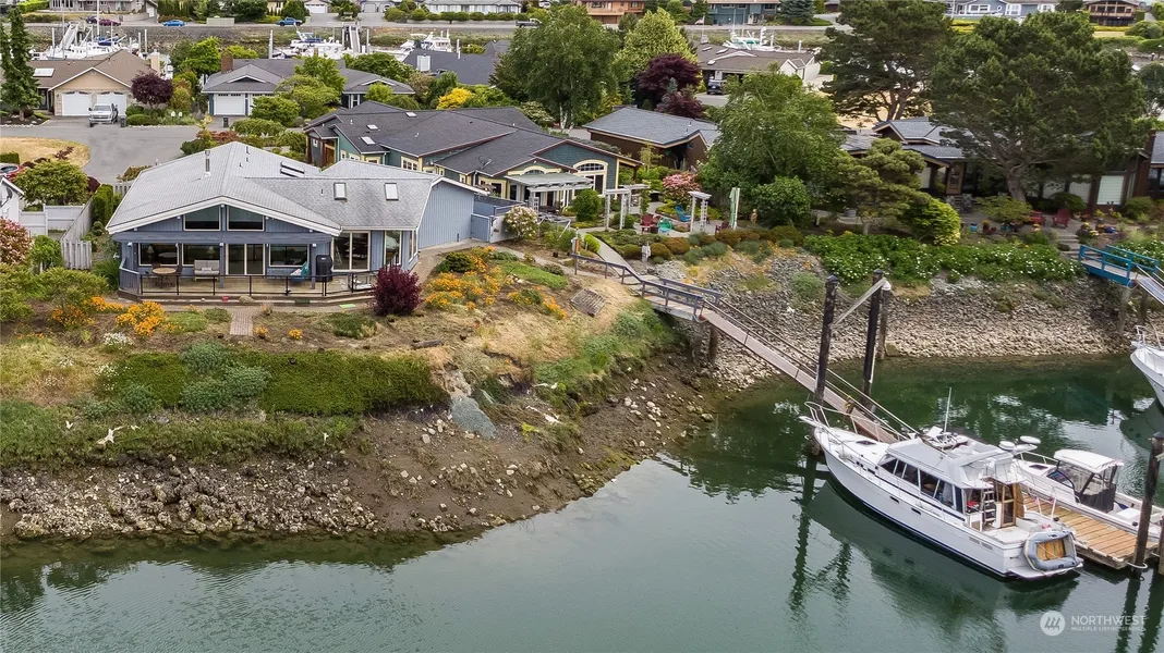 Custom waterfront home at the Marina offers stunning SW sunsets. Enjoy personal ownership of a shared 40 private dock with separate power and water supply. Irrigation system for easy garden maintenance. Entertainment sized Ironwood deck with glass paneled screens. Custom exterior roll shades for summertime light & heat control. Pella tinted windows & skylights. New heat pump 2023 with full HEPA filtration & AC. Convenient climate-controlled freestanding gas stove. Porcelain tiled flooring heated in baths and kitchen. Thermador gas range, dishwasher and French door refrigerator. Quartz countertops, under cabinet lighting, oversized porcelain sink w/InstaHot. Bosch washer/dryer. 1 1/2 car garage w/storage space. Wired for back up generator.