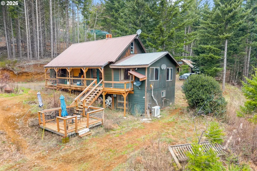 Tucked away on 5 wooded acres in the desirable Underwood area, this charming bungalow offers privacy, character, and sweeping Columbia River Gorge views. Originally built in 1915 as a small cabin, the home has evolved over time with multiple additions, including a living room, kitchen, bathroom, and utility room creating a functional and comfortable retreat. The home offers 2 bedrooms, with county reflecting 3; the primary bedroom is located on the main level, and the attic is utilized as a second bedroom. Approximately 1,121 sqft of finished living space is complemented by an unfinished basement of approximately 752 sqft plus additional low ceiling and laundry areas offering storage and utility flexibility. Enjoy eastward Gorge view from the home, including the Hood River Bridge, Bingen lights and vistas extending toward Mosier. A full length covered front deck invites you to relax and take in the scenery with steps leading down to an uncovered sitting deck. The property also features a covered front entry, an old shed/barn and a graveled road providing a secluded approach. Recent fire mitigation work includes tree removal and limbing around the home and the on-site sewage system has been repaired following pipe maintenance. Located just 15 minutes from the Hood River Bridge, the property offers a peaceful wooded setting with reported panoramic Gorge views from the top of the acreage. A rare opportunity to own a private slice of the Gorge with history, views and room to explore.