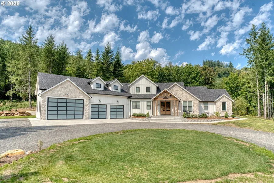 Private & secluded, gated 20-acre property, 20 min from town, Stunning & inspiring Custom-built Farmhouse! Nice Layout w/ open great room w/ wood Burning stove & Vaulted ceilings and Open large windowed doors that open onto extensive cover patio, Open Concept Kitchen & spacious dining room w/butler's pantry & good size pantry, features high-end appliances, quartz counters, double oven, Hardwood floors throughout all house, Heated tile floors in all baths, Primary bedroom on main level w/ coffered ceilings, fireplace, dual sinks, soaking tub, nice tiled shower & great size walk-in closet, 5 zoned HVAC system, central vac, secondary ventilation system, Den/office w/built in desk & cabinets , 2 roomy bedrooms w/walk in closets, Roomy and spacious bonus room w/sink & cabinets also w/plumbed and pre wired for ADU option, laundry room w/cabinets, sink & laundry chute, 4 car garage w/fast car charger, garage heater, Backup generator, very private property w/ATV trails throughout the property, night lights throughout, Four streams w/two year around, 35 year forest w/one hundred year old mixed trees, Lawn sprinkler system, Shop & Barn w/power, Fire pit & Playground and more! Truly one of a kind!