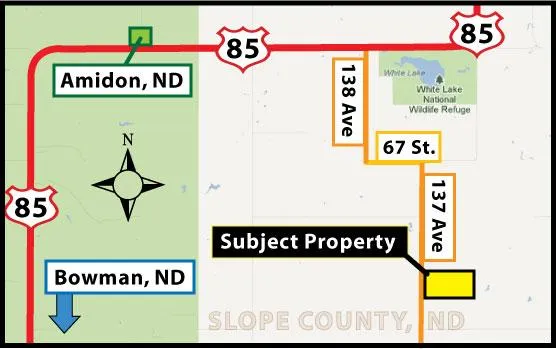 Research Parcel InformationDriving Directions: From Amidon, ND: Drive 4 miles east on HWY #85, then 2 miles south; 1 mile east; 2 miles south. This will bring you to the northwest corner of the subject property.