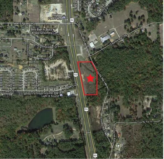 This is a 5 acre tract located north of Bullard on SH 69, between FM 344 and FM 346. It has 736' of frontage on SH 69 (east side of highway) and has a depth of 240 - 345. It is outside any city limits, but only 2.25 miles north of Bullard.