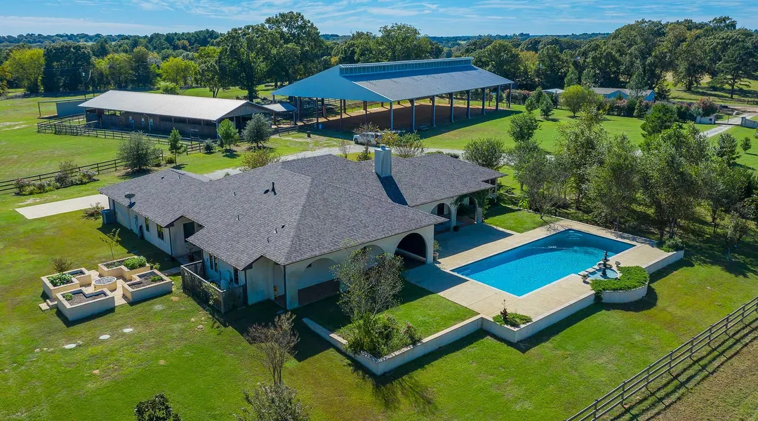 The custom built, luxury home and pool is part of a horse lovers paradise. Covered arena, horse barn, paddocks and guest house are within walking distance of your front door. The impressive drive up appeal, gated entrance and impressive views make this property a must see. The Green Mansions Headquarters Section is located approximately 15 minutes northwest of Tyler, Texas and 85 miles east of Dallas, Texas. The small community of New Harmony is located nearby.