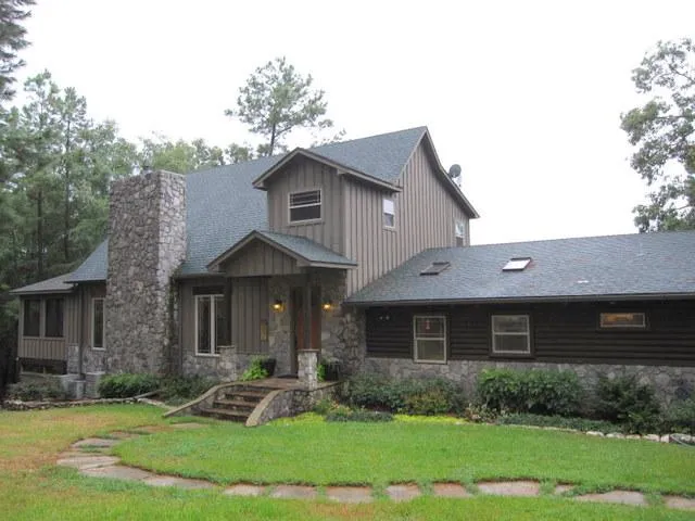 Serene, peaceful and lots of privacy. Now this is an interesting house. The original house was a log cabin built in 1970, the main house was added on to the log house in 2005. The house in 2005 was built by Craig Klaussen. Enter the foyer to hand scraped hardwood floors that flow into the main areas of the house. Kitchen overlooks living area with a huge granite breakfast bar. Wonderful detail in kitchen, custom cabinets, stainless appliances including double fridge/freezer, river rock stone detailing. Living area has hand hammered wood beams & river rock fireplace and opens to the formal dining and huge screened-in porch. Master suite with private balcony overlooking the stocked pond. Luxurious bath with walk-in double shower. The rustic side (log cabin side) has