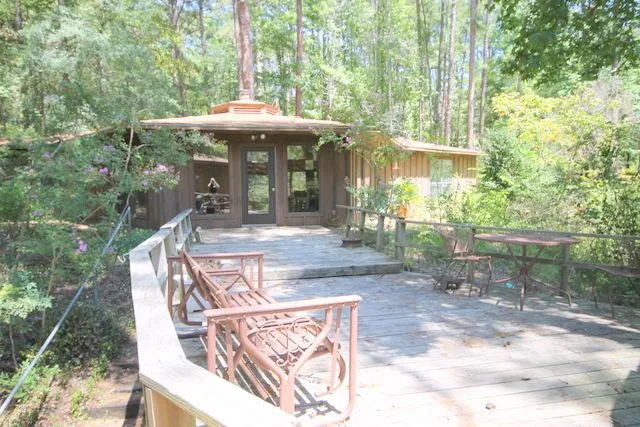 Private Retreat! Come and see this one family owner home that has been lovingly maintained with a little over 15 acres. You will enjoy all the crepe myrtles and fruit trees as you drive from the front gate to the lovely home. Could be a great weekender or a full time resident! Spectacular and private property that sits back off the road, has a large pond, deck, and a separate bunk house. Lots of trees, wildlife. This is a octagon shape home with windows across the back to take advantage of the views! It's a 3-2 with a 2 carport, very large deck on back that look out over the property and pond. Needs some updating, and owner has replaced the carpet. Owner believes the bunk house is not included in the square footage.