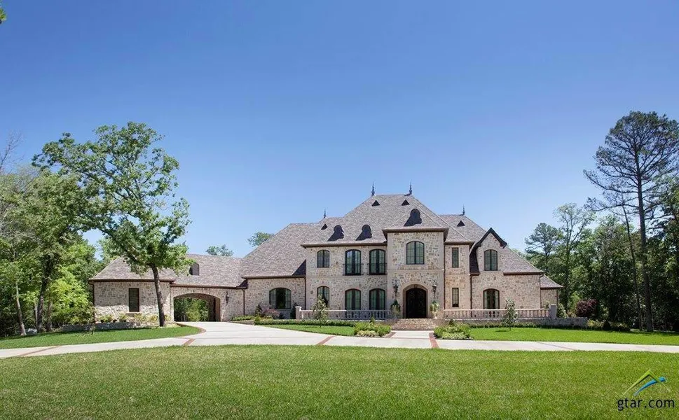 Custom-designed & built; this masterpiece was constructed in 2015 w/amazing quality features, extensive millwork & built-ins throughout. The solid Granbury Stone exterior, lge Sandstone cov'd front porch, mansard roof line, copper finials, gutters, downpipes & dormer windows are all distinctive of this French manor home. Wide tree-lined driveway leads to impressive gated entry w/stone columns, wrought iron gate & fencing. Secluded from main roads view by dense thicket of trees; so peaceful & quiet! Emerging from the woods, one sees the 2-story stately home w/scored concrete circular driveway. Magnificent estate-type home; meticulous attention to every detail. Features 3 living areas, including study, + media rm, complete w/kitchenette. A grand entry hall, accented by winding custom wrought iron staircase, opens to the formal dining room & formal living room. Kitchen w/island, prep sink, Sub-Zero refrigerator, icemaker, 2 dishwashers, 3 ovens including Wolf range/oven, granite countertops & vent-a-hood of hand-painted cast stone. Separate room off kitchen w/extensive custom cabinetry for storage & lge pantry; includes a baking center with out-of-site storage for small appliances. Separate butlers pantry w/Sonic icemaker, sink, coffee station, china/crystal cabinets & custom-designed wine room. Lge outdoor living & dining area w/stone fireplace, TV over mantle, complete kitchen including SS grill, refrigerator, icemaker & DW, full tile bath & heated gunite pool/spa w/water features. Custom wrought iron backyard fencing. Adjoining covered porch spans back of home; great entertaining area! Concrete drive leads to separate 40X60 shop w/guest house/office featuring workout area, full bath, kitchenette w/antique bar & cabinets; stairs to add'l storage. On apx. 70 wooded ac., across road fm LK. Tyler, access to public boat ramp & private docks just min. away. Buyer could divide land into pastures or subdivide & sell tracts. No restrictions.