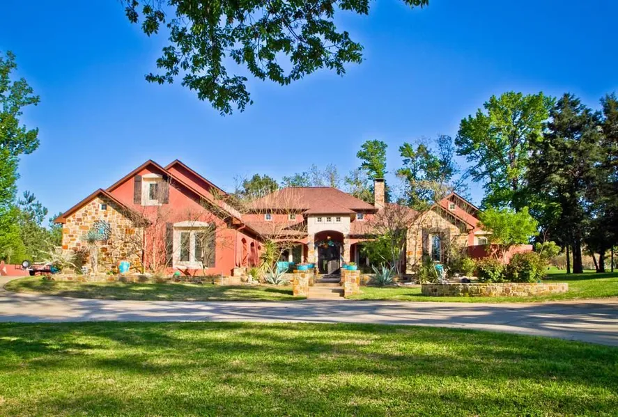 Enter private drive to 1.24 acres on golf course cul-de-sac. One-owner custom built by Eddie Barnes: 3-3.5-3 + study. Archways, concrete floors, soaring ceilings. Living room with fireplace open to dining room open to kitchen all overlooking golf course. Kitchen offers arched ceiling, granite, Wolf 6-burner gas cooktop, double ovens, warming drawer. Study-office is cactus rib ceiling. Windows are roll out Four Seasons. Oriental built-in hutch in kitchen with wine rack. Half bath with red glass tile. Guest bedroom with walk-in Roman shower, marble tile floors. Another guest bedroom with a private shower. Master bedroom with gas fireplace, vaulted chocolate Labrador tile ceiling, coffee bar in master area, custom birch doors, his and her sinks, 6' jet tub with seaweed glass accompaniment + outside shower area. Covered patio + open flagstone patio & fire pit. Three garden houses in side yard. Gorgeous Japanese persimmon. Tucked away for privacy. Overlooks pond and green on golf.