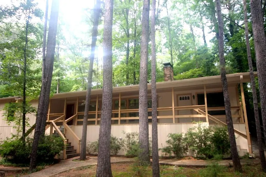 Hidden in the Woods! Two lots with one dues - two large bedrooms, 2 baths, + an office. Covered deck in front, deck in back. Contemporary with vaulted soaring ceilings with clearstory windows. Living room with flagstone fireplace, opens to breakfast area and kitchen all viewing the floor to ceiling windows looking at trees + creek in front yard. Private drive to reach this property!