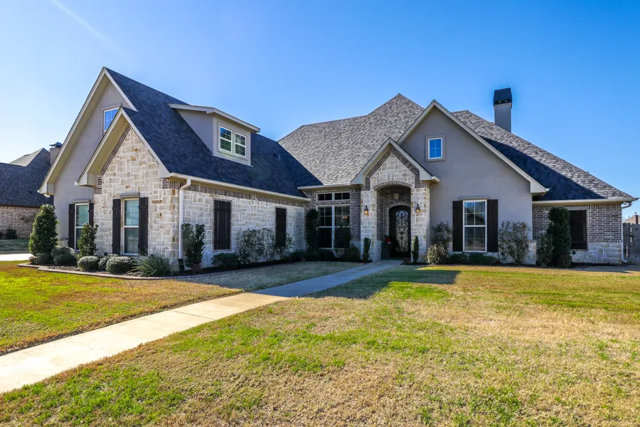 Absolutely, beautiful home located in Windsor Estates. Beautiful sunsets! This home was built by Hunt Custom Homes with gorgeous features. 4 Bedrooms, 3 Baths, 2 car garage, room above garage could be your office, media, or game room. Great floorplan, one bedroom and bath in the front on the North side, Master on the Northwest side, and two more guest bedrooms on the South side of the home. Good flow, Open concept, Wood beams, crown moldings, ceramic tile, granite, stainless steel appliances, and custom cabinetry. Formal dining plus breakfast room. Stone WBFP, with built in's and wood flooring. Master has all the amenities, separate lavatories, granite, garden tub, separate shower and walk in closet. Very clean, ready to move into. Covered back porch, cement pad for basketball or an additional patio. Aerobic septic, .510 acre in Bullard ISD. You need to see this one! Happiness awaits you...