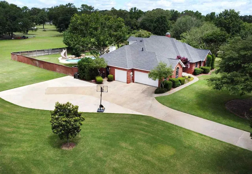 5 Br/3.5 ba/ 3 car garage located on 2.360 acres south of Tyler. Inviting saltwater pool with hot tub and much enjoyable Firepit! This home is located in a small subdivision with 1-3 acres lots. Yard always manicured. so much room for extra parking in driveway. Home features a nice size formal dining located off of kitchen with beautifully stained kitchen cabinets, tile countertops with white backsplash, includes butcher block island, and breakfast bar. Breakfast area dining has large windows that look out over pool area. Family den with fireplace, all warm and cozy. Formal living room with wood floors and fireplace also looking out on patio to pool. Large master bedroom with jacuzzi tub with updated tile shower, along with separate vanities. Master bedroom has private door that leads out to pool area. 3 guest bedrooms down stairs . Guest bathroom has dbl vanities. There is a half bath located downstairs. Office or study with side door for easy outside entrance. Upstairs includes 5th bedroom with very own bathroom/ shower also included extra play area or Tv room. Plenty of room in this house. Such a peaceful private property. Survey is available.