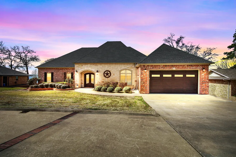 Discerning buyers will appreciate this exceptional waterfront home with breathtaking open water views of Lake Palestine! With approx. 6850 sq.ft., this 5 bedroom, 5 bath home has wide crown molding, 9-12' ceilings, solid oak & tile floors on main and lower level, granite counters, & 3' doors on all bedrooms. Enter through double doors to the main level living & dining area that welcomes you with breathtaking lake views, including access to the elevated porch that spans the back of the home. A gas stone fireplace adds to the ambience, flanked by custom built-in cabinetry. Open kitchen has large island with 2nd sink, stainless warming oven, convection oven, microwave/convection oven, ice machine, dishwasher, gas cooktop, and built-in refrigerator. The primary suite, located on main level, benefits from the incredible open water views and access to the 2 nd level back porch, as does a separ...