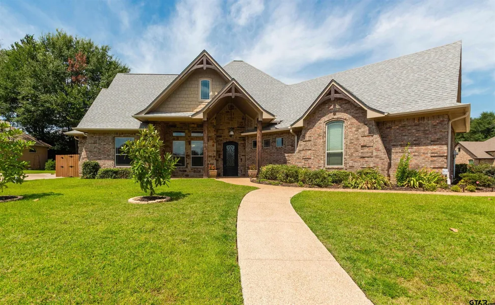 Tucked away in the scenic Greater Tyler area, this stunning home offers the perfect blend of space, charm, and comfort. With 3 bedrooms, 2.5 baths, and over 2,500 square feet of living space, it’s a home that truly has room to grow. From the moment you arrive, the home’s beautiful exterior and covered front porch invite you to relax with a cup of morning coffee or unwind while watching a Texas sunset, as well as a beautifully shaded covered patio out back. Step inside and you’re welcomed by a warm and functional layout. The entryway features a unique double-sided fireplace that gracefully separates the dining area from the spacious living room. The dining space is ideal for hosting family dinners or intimate gatherings and includes windows that frame peaceful views of the front yard. The living room is bright and open, boasting large windows that overlook the backyard and seamlessly connect to the kitchen. The kitchen is both stylish and practical, complete with a generous breakfast bar, ample cabinet space, and a cozy dining nook for casual meals. The primary suite is located on the main floor and offers a peaceful retreat, complete with an en-suite bathroom featuring dual vanities, a garden tub, a walk-in shower, and a large closet. Two additional bedrooms are also downstairs and share a convenient Jack-and-Jill bathroom. A versatile office or flex space and a half bath tucked under the stairs round out the main level. Upstairs, a large bonus room provides endless possibilities—perfect as a media room, game room, or second living area. Step out back to enjoy the beautifully shaded covered patio, overlooking a spacious green yard that’s ideal for entertaining or relaxing. Spacious, inviting, and full of thoughtful features, this home is ready to welcome you in.