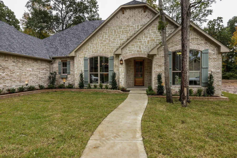 "European Charm" built by Glenn A Smith. Spec home with so many features that resemble a custom home. Great location, minutes from shopping, banking and restaurants. 4 bedrooms, or it could be 3 bedrooms with a game room, office or media room located off the family room. 2.5 baths and a 2 car garage with extra driveway for parking. Separate dining room, Family room with wood beams, posts, accents and stone fireplace. Open concept, kitchen with granite, marble and brick backsplash, stainless appliances, copper farm sink, and large granite island. Distressed wood flooring, carpet in bedrooms, tile in baths. Designed tile in showers. "Family Hub" in mudroom with built in desk and half bath. Master closet opens to Laundry room, so convenient. Love the lighting in all areas! Covered back porch, wooded and private. Landscape lighting in front yard just makes the home stand out! And you will love the window box! Foam Insulation, Tankless HWH. This can be your next Happy Place!