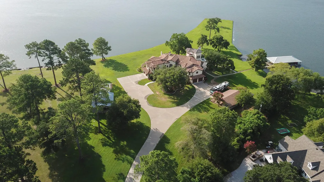The Castle on Lake Tyler with stunning, panoramic views on a 3.949 acre setting. Attention to detail is evident throughout the custom built property...from the wrought iron gate at the entrance, the circle drive, and imported stone and tile roofs, to the home's vaulted ceilings, custom woodwork and floor-to-ceiling glass windows to take advantage of the water views. There is also a gourmet kitchen with chef's stove and hammered copper sink, a wet bar, formal dining room and stone fireplace. The master suite has a relaxing "rain room" (structured with high ceilings to enjoy the rain), as well as a walk-thru shower and large soaking tub in the master bath. The 2nd floor has a media room with kitchenette, a game area, and a mother-in-law suite. On the 3rd floor you'll find an observation deck with panoramic views, and a beautifully appointed private office. Enjoy the outdoors with several places to relax on the patio or balconies, swim in the saltwater pool or relax in the hot tub. There is also an outdoor kitchen, a boat house and caretaker's home on the property. DON'T MISS THIS ONE!