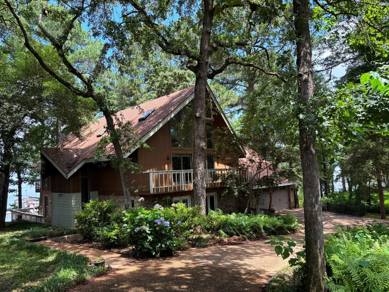 This is the quintessential lake home so hard to find on lake Palestine! Three waterfront lots, 1Acre, in the desirable neighborhood of Hide a Way Bay with lush landscaping, incredible views, great water--- so serene and private. Not your cookie cutter lake home! As you enter you will be amazed by the breathtaking water views from the great room with double French doors opening to the deck that runs the length of the house to allow additional outdoor living space. Inside, a woodburning fireplace competes the room for those chilly winter evenings. The dining room has a vaulted ceiling and with two walls of windows bringing the outside in. The kitchen enjoys water views as well and has Italian ceramic tile, a wet bar with a sink in the shape of Texas, and on the opposite end there's a breakfast bar. Two bedrooms and full baths are downstairs. Both light and airy bedrooms have French doors taking in the front gardens. Going upstairs, enjoy the wide stairwell with vaulted ceiling, skylight and multiple windows bathing it in light. Step into the game room and be amazed by the soaring beamed ceiling, wall of windows, wood flooring and built-in shelves and cabinets. French doors here step out onto a balcony overlooking the front landscaping. There's also a bunk room the kids just love! Across the hall is the primary bedroom with another soaring beamed ceiling, wall of windows overlooking the lake, French doors leading out to a private water view balcony and a wood burning fireplace. The primary bath has double sinks, a whirlpool tub, skylight and a huge shower---very mountain spa like! The boat house has an enclosed boat storage area with electric lift, there's a covered deck, open fishing deck and upstairs sunbathing and sunset and star watching deck! The water here is excellent for all your water sports! The yard is watered with an automatic system using water pumped from the lake to keep it green and lush all year. Call now to see about making it yours!