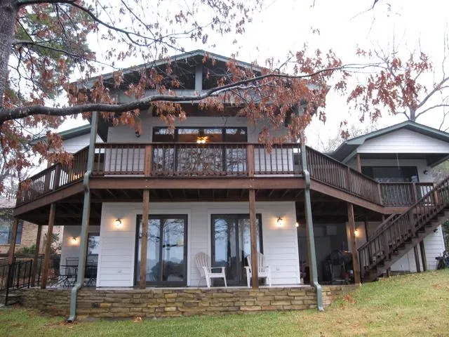 Spectacular waterfront. Lots of attention to detail in this sprawling waterfront home. Panoramic views of the lake from just about every room. Large kitchen that has been updated with breakfast bar. Large living area with casement windows, vaulted ceiling and separate cozy sitting area with a wood burning stove. Master suite is on the lake side with tons of closet space. Two guest bedrooms have a bath in between them. Lower level has a wonderful bar area with wine cooler and fridge and game room. There is another room that this owner is using as a bedroom but could be an office or exercise room. Wrap around decking maximizes the view of the lake. Great boathouse with lift and pier. Wrought iron fence around the property. Enter on the main level that has the kitchen, living three bedrooms and two baths. Just the bar area and game room are on the lower level.