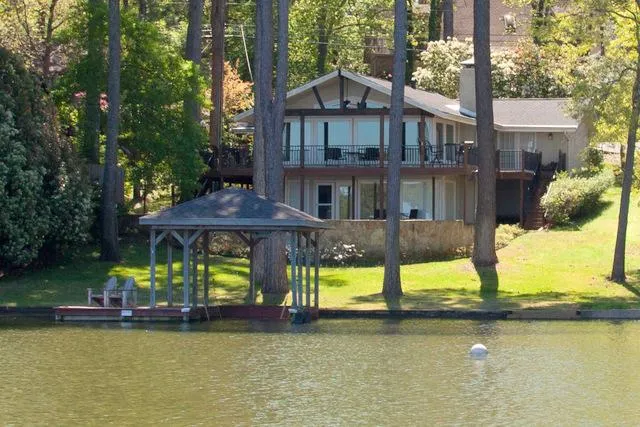Great waterfront home with fantastic views. Open living area surrounded by double paned glass windows. Two bedrooms up with a bath, master is down with its own bath, utility room and walk-in closet. Recent updates include roof, water heater, HVAC system, large wraparound deck upstairs. Beautiful flagstone patio down. Boat house has lift and features a sitting area to enjoyu the lake and views.