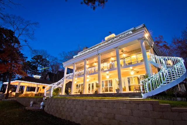 Stately Waterfront on 2 Lots! Stunning views from every window in this gorgeous 3-story lake home! Updated throughout! Highlights include third floor master-suite with hardwood floors, panoramic lake views, wood-burning fireplace, his/her vanities, large closet, washer/dryer and balcony. Main floor features great room with panoramic lake-view, gas-log fireplace, hardwood floors, marble-tiled foyer, marble-tiled baths, 2 dining, granite kitchen with huge island, 6 burner gas stove/grill, sub-zero fridge, instant hot water, stainless appliances, double oven, warming drawer, dumbwaiter, 2 bed/bath and balcony! Bottom level boasts 2nd living with wet bar/sink, third fireplace, 1 bedroom and bath, new carpet, large storage room/pantry/wine-room, utility room and covered porch.