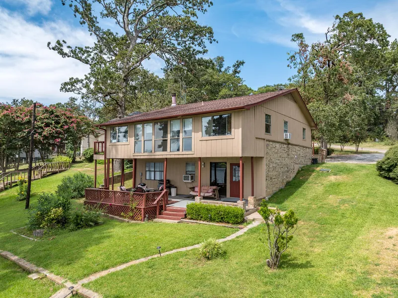 Charming Lakefront Home with Stunning Elevated Views on Lake Palestine! Welcome to this reasonably priced 1,734 sq. ft.,2-bedroom, 2-bath home, perfectly situated on Lake Palestine with rare 7'+ water depth, ideal for water enthusiasts! The home needs some cosmetic updates, offering the perfect opportunity to add your personal touch, but with important updates already in place: appliances are less than 10 years old, and the HVAC system is only 2-3 years old. Enjoy the beauty of lakefront living from your sunroom, which is heated and cooled for year-round comfort, or cozy up by the stone corner wood-burning fireplace in the living area. The main level features an open living/dining area, one bedroom and one bath, while the downstairs has an additional living space plus one bedroom and bath which open up to a patio that spans the length of the home. Additional highlights include an alarm system, automatic sprinkler system (using lake water for the backyard), and a 1-stall boathouse with 7'+ water depth! Facing southeast across the lake provides gentle southerly breezes and shady afternoons by the lake. For storage or hobbies, theres an onsite shop, plus a 1.5 car garage. Thoughtful exterior features like underground gutters help prevent erosion. Don't miss the chance to make this lakefront retreat your own!